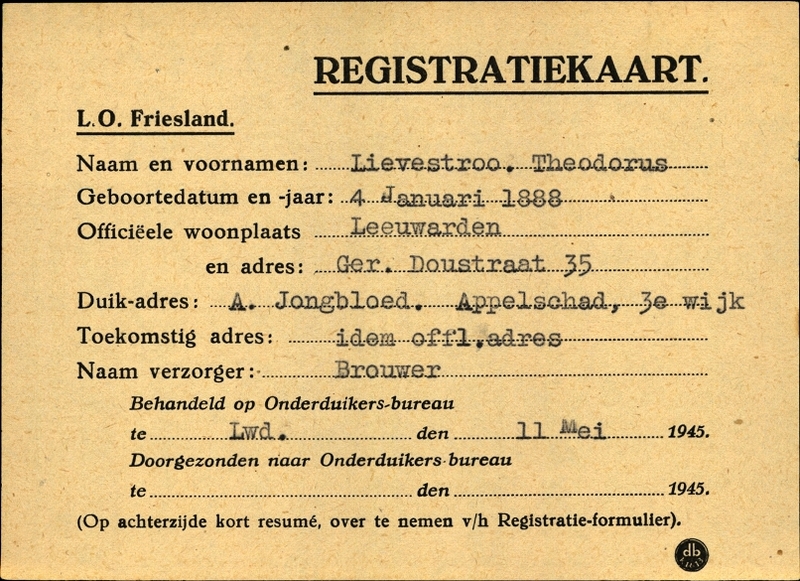 Duikadres: 3e wijk, Appelscha - Oorspronkelijk adres: Gerard Doustraat 35, Leeuwarden - Reden onderduik: staking - Overige opmerkingen: Achterkant bijzonderheden: Werkzaam geweest als machinist NS. - Ondergedoken wegens spoorwegstaking. - Beroep gewijzigd van PB (verknoeid) - Achterkant beroep: Machinist - Achterkant naam werkgever: NS