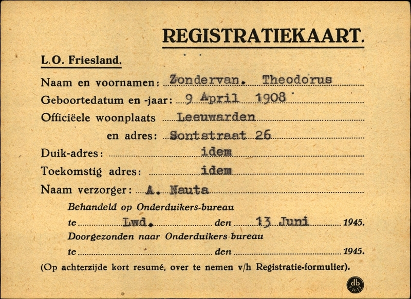 Duikadres: Sontstraat 26, Leeuwarden - Oorspronkelijk adres: Sontstraat 26, Leeuwarden - Reden onderduik: arbeidsinzet - Overige opmerkingen: Achterkant bijzonderheden: Geen st. (in Drente afgepakt). - Wel stkrt. - Achterkant beroep: Fabrieksarbeider - Achterkant naam werkgever: -