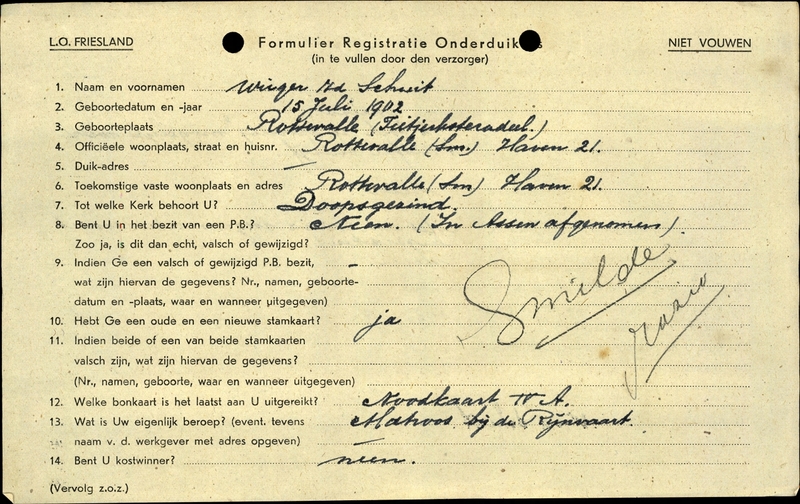 Duikadres: Haven 21, Rottevalle (Gem. Smallingerland) - Oorspronkelijk adres: Haven 21, Rottevalle (Gem. Smallingerland) - Reden onderduik: arbeidsinzet - Overige opmerkingen: Bijzondere opmerkingen: met een razzia wegens arbeidsinzet ingerekend.