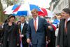 Bezoek prins Willem-Alexander ter gelegenheid van de herdenking van de bevrijding van Breda in de Tweede Wereldoorlog. Gezien op de voorgrond van links naar rechts Daniela Schadt (echtgenote van de Duitse bondspresident Joachim Gauck), Prins Willem-Alexander en Commissaris van de Koningin van Noord Brabant Wim van de Donk op weg naar de officiële start van de herdenking waar minister-president Mark Rutte het bevrijdingsvuur zal aansteken