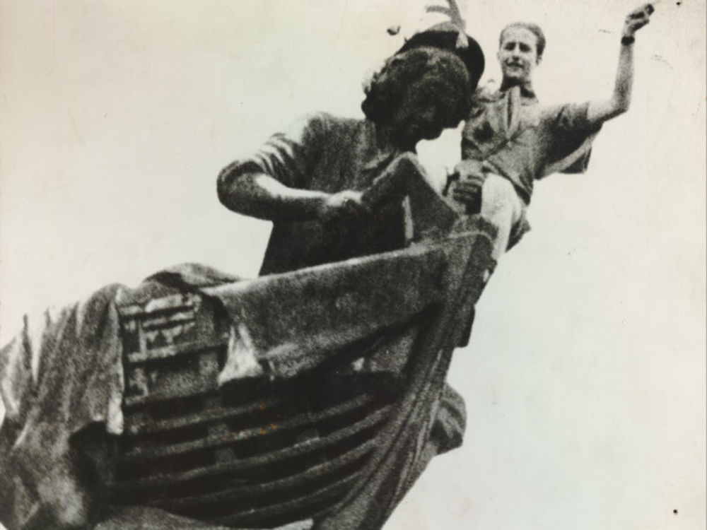 Foto jongen vogelverschrikker in Duits uniform op terrein kazerne (?) (wellicht Ripperdakazerne Haarlem). Tekst achterop: "Bevrijding".