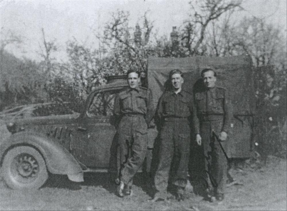 Drie mannen in vieze oude uniformen voor een paard; op de achtergrond een huis en bouwmaterialen