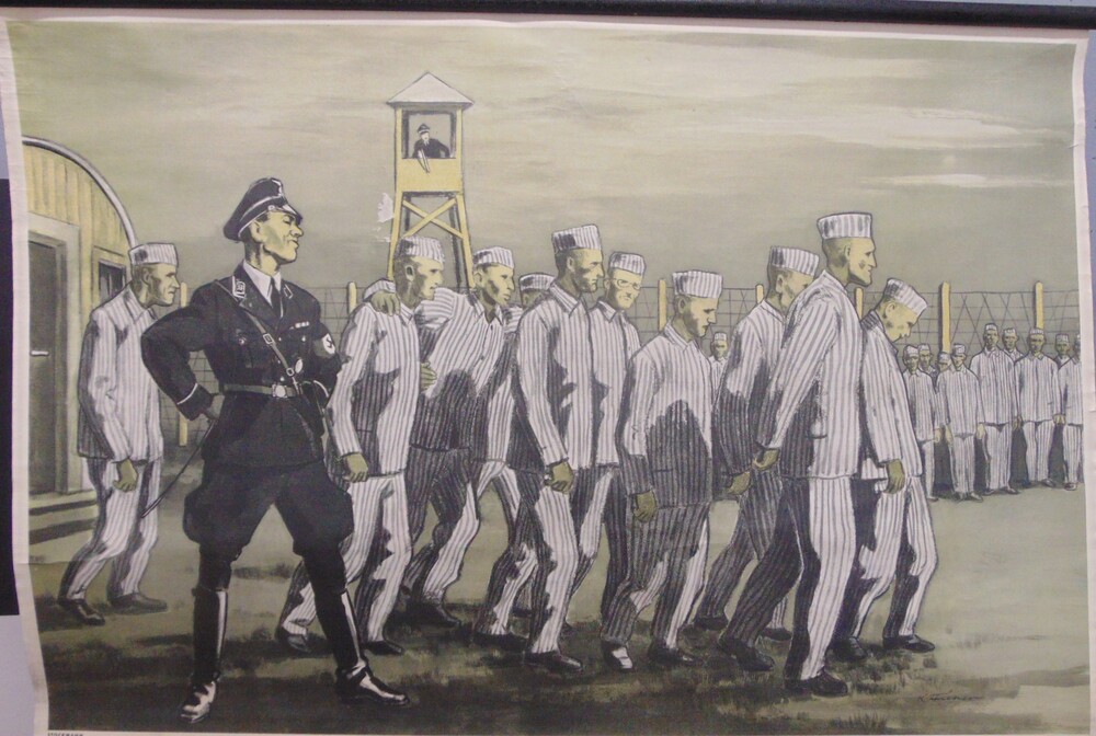 Wandkaart, schoolkaart, Nächste Quäkerspeisung FreitagDuitse kaart. Gekleurde reproductie van een prent die een klaslokaal toont waarin twee vrouwen in verpleegstersuniform voor het bord en aan de balie eten uitdelen aan leerlingen die in rijen achter elkaar staan opgesteld. Op het bord staat: “Volgende Quaker-voeding vrijdag. STOCKMANN Afbeelding 3 Nood en ellende in de naoorlogse periode De Quakers helpen door de uitgehongerde kinderen te voeden. PAUL STOCKMANN VERLAG BOCHUM
