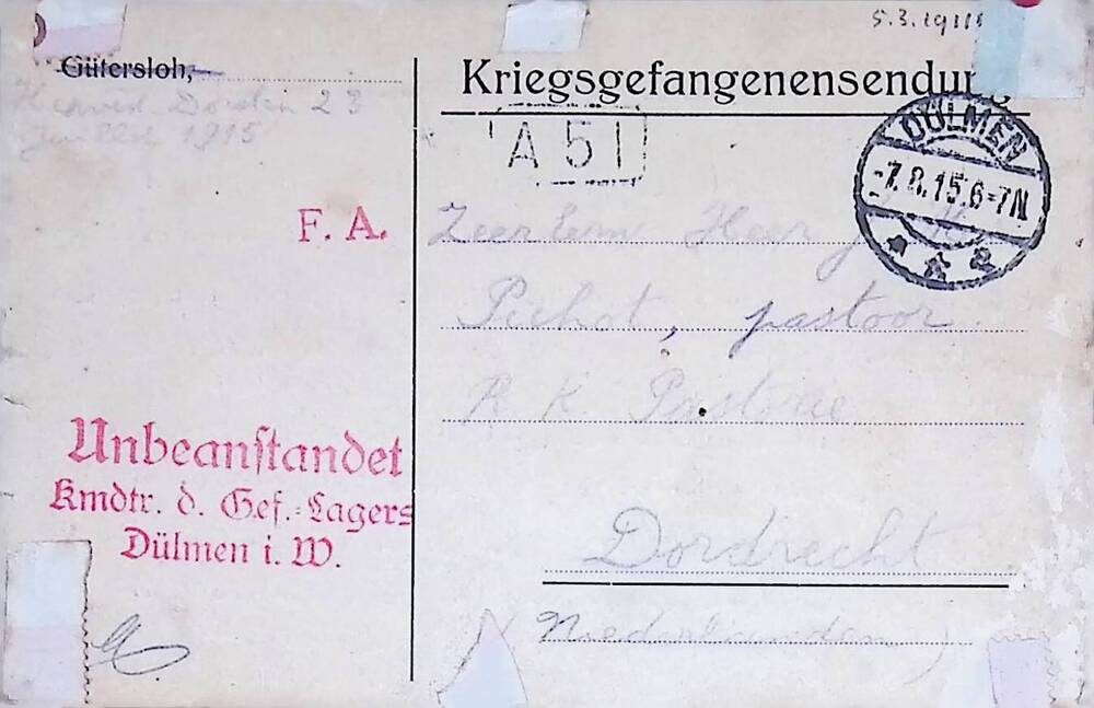 Duitse militaire briefkaart geadresseerd aan pastoor Pichot, Dordrecht, d.d. 26 juli 1916. afkomstig van Gefangenenager Dülmen in Westflen. Tijdens de oorlog werden ongeveer 10.000 krijgsgevangenen gehuisvest op een oppervlakte van 50 hectare