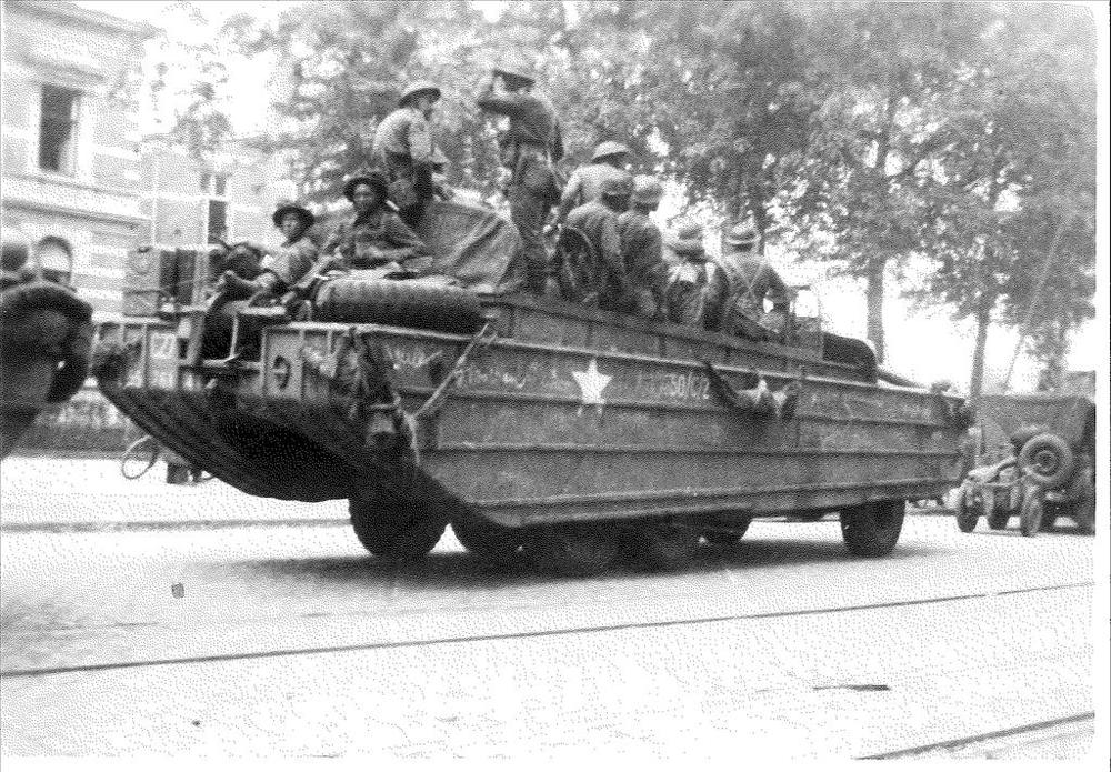 Foto van drie Engels rupsvoertuigen mogelijk op de Groesbeekseweg of Oranjesingel in Nijmegen