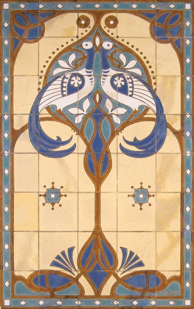 Wandbord met twee paradijsvogels en gestileerde bloemen.