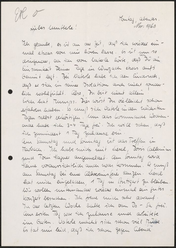 Brief van Hubert (zoon) aan Ella (Mutterle), 11-1963Zojuist jouw kaart uit Wurzach ontvangen. Het doet me goed dat jij je in deze omgeving goed voelt en je met de kamer getroffen hebt. Van vader hoorde ik dat je veel kaarten uit Heilbronn krijgt.Wij hopen allen dat je weer met "rechte voeten" naar huis komt.Mij gaat het naar behoren. Mijn dienst op de afdeling bevalt met goed, vooral als ik echte zorg verleen en geen vloeren hoef te vegen. Mijn leidinggevenden heb blijkbaar gemerkt dat niet met de bedoeling hier ben om me er met een "Jantje van Leiden" van af te maken.In het koor dat hier ieder jaar met kerst wordt samengesteld heb ik ook een mooie taak gekregen. Gisteravond zat ik tot 11 uur aan het kopiëren van "Hört die Engel helle Lieder". Om dat ik geen voorbeeld had moest ik alle drie stemmen uit mijn hoofd opschrijven. Op een stuk verloor ik de herinnering en moest ik thuis opbellen en vader de passage voor laten zingen. De koorleider lijkt erg blij daarmee te zijn, op maandag mag ik hem vervangen. Je ziet dat het aan werk niet ontbreekt, maar het is fijn werk. Vanavond een groot herfstfeest voor het personeel. Met een ander verpleger en 2 zusters hebben we een kleine scene samengesteld. Er volgt een uiteenzetting van de opbouw en inhoud van de sketch. Als alles lukt denkt hij de het geel gewaardeerd wordt. Komende woensdag gaat hij naar huis en donderdag meteen met Gerhild naar Gaildorf . Voor leergang voor Squares heeft zich tot nu alleen Toni Hafner zich aangemeld. Ik wacht nog tot maandag, dan stuur ik de aanmelding van hier uit.Nou dat was het. Mij rest alleen nog jou voor jouw verblijf alles toe te wensen wat je er zelf van hoopt. Dus hou je goed.Hartelijke groeten Jouw Hubert.