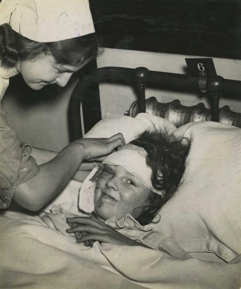 Foto van kind met verbonden hoofdwond in een hospitaal bed. Kind glimlacht terwlijl het door en verpleegster gestreeld wordt. Tekst: "Return of the Germans". When the Germans, early this year, replied to R.A.F. raids on Berlin by dropping bombs in dayight on a children's school at Lewisham in South London, the A.R.P. service, though they had had little practice since the last of the heavy raids in May, 1941, took up their work as smoothly as ever".