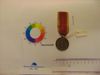 Onderscheiding. Duitsland. Medaille für deutsche Volkspflege. Onderscheiding voor zowel burgers als militairen die zich op verdienstelijke wijze hebben ingezet voor het welzijn en de verzorging van het Duitse volk. De onderscheiding werd op 1 mei 1939 ingevoerd ter vervanging van het Ehrenzeichen des Deutschen Roten Kreuzes. De onderscheiding is gemaakt van verzilverd brons of zink en hangt aan een rood lint met aan beide zijden dunne, witte lijnen. Het lint aan dit exemplaar is vuil en dof verkleurd. De onderscheiding is rond (diameter 38 mm) en is aan de voorzijde voorzien van een kruis met daarop de Duitse adelaar en hakenkruis. Aan de achterzijde is de tekst 'Medaille für deutsche Volkspflege' aangebracht. De medaille verkeert in goede staat, hoewel het zilver donker verkleurd is. Het lint van dit exemplaar werd bij elkaar gehouden door een speld. Het is onbekend of deze speld origineel is of later er in is gestoken. De speld is uit het lint verwijderd maar wel bij de onderscheiding opgeslagen.