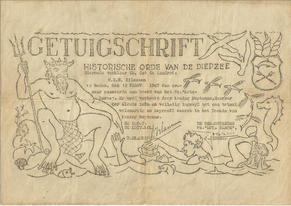 getuigschrift - historische orde van de diepzee. "Verklaring dat dhr. van Rhijn op 8 november 1946 den evenaar passeerde aan boord van het schip de M.S Kota Baroe"