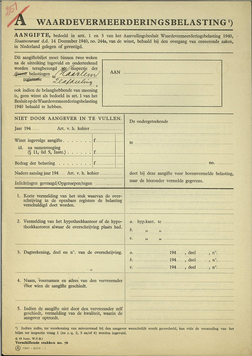 Aangiftebiljet, waardevermeerderingsbelasting, 1941-1942