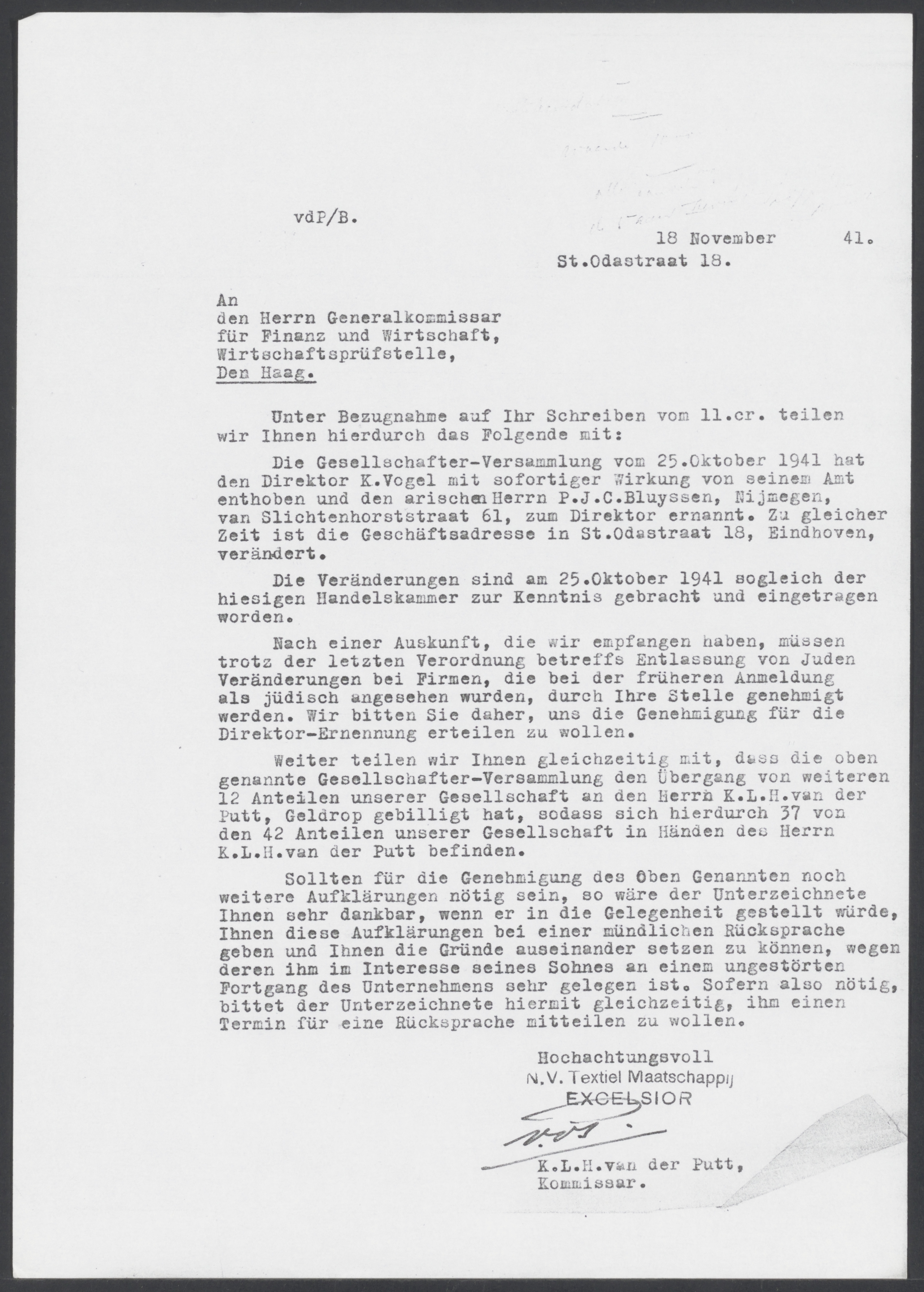 Van: van der Putt' K.L.H. Aan: de Commissaris-Generaal voor Financiën en Economische Zaken Plaats: Eindhoven Datum: 1941-11-18 Onderwerp: aanpassingen van het bedrijf en het ontslag van zijn directeur Kurt Vogel.