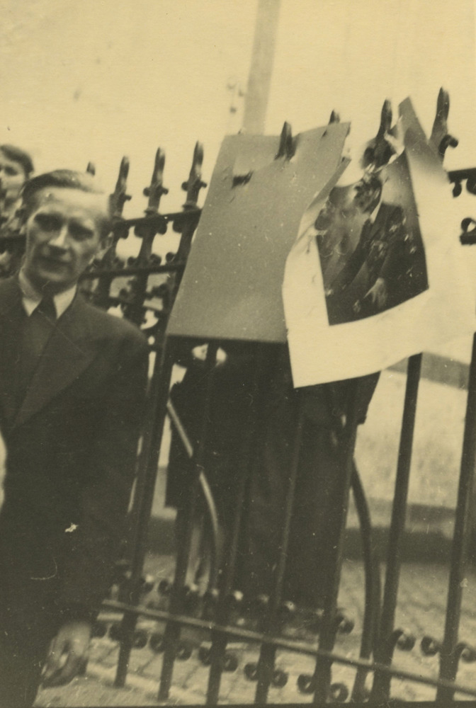 De burgerbevolking heeft een portret van Hitler op een hek gespietst.