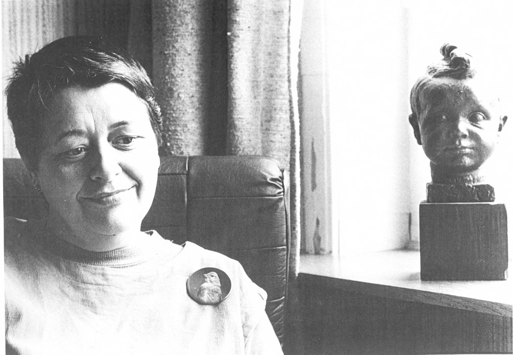 Recente Foto Van Loekie Welling-van der Veen met het beeld 'Kinderkopje met krul' , dat haar vader, Gerrit Jan van der V...