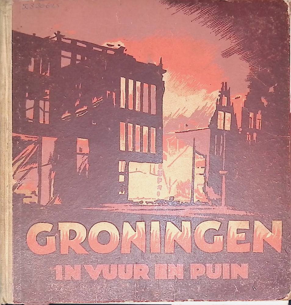 Groningen in vuur en puin 1945. "tweede druk" "uitgegeven door Jan Haan N.V. te Groningen 1945" "boekje is in slechte staat" "in het boekje een bedankkaartje voor de Familie Hofman"
