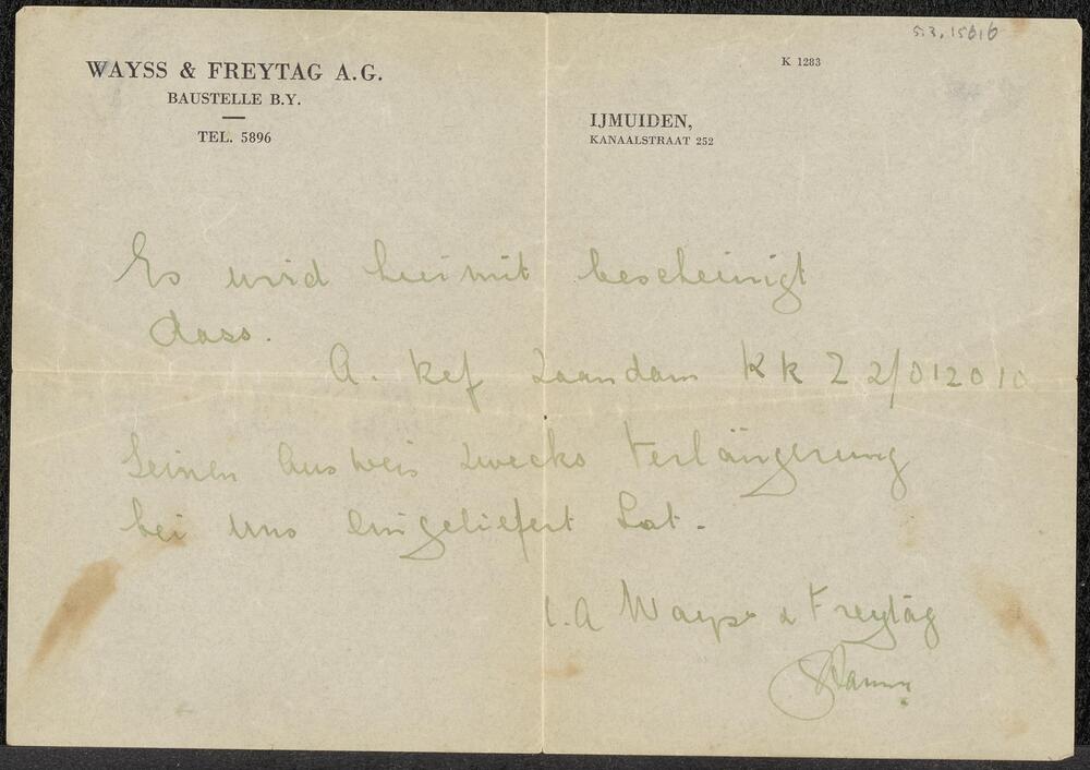 Brief van Wayss & Freytag A.G., IJmuiden, Kanaalstraat 252 aan A.Kef . Hij heeft zijn Ausweis bij hen ingeleverd om te verlengen, ongedateerd.