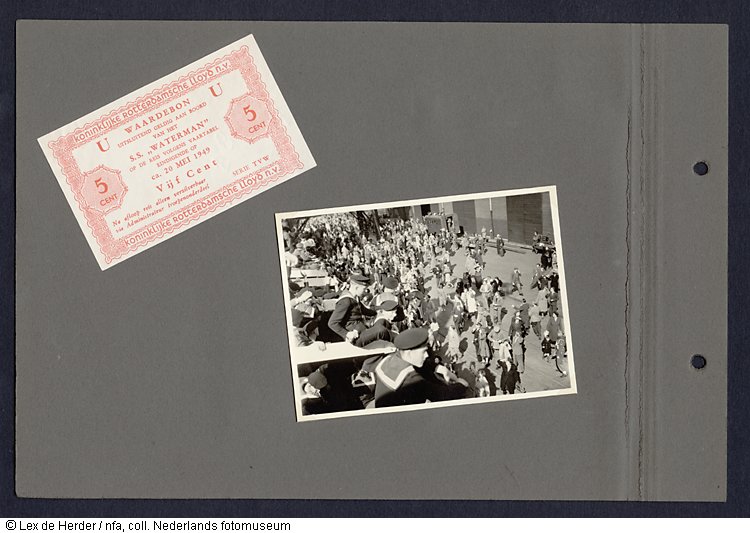 Verwanten op de kade bij vertrek uit Rotterdam en waardebon te gebruiken aan boord van de s.s. 'Waterman' (1949), p. 2 uit fotoalbum ...