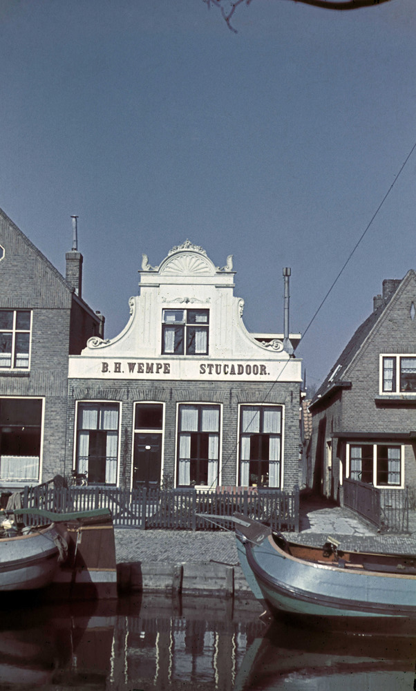 Klein laag huis met klokgeveltje van B.H. Wempe Stucadoor, gelegen aan een gracht met enkele aangemeerde boten.