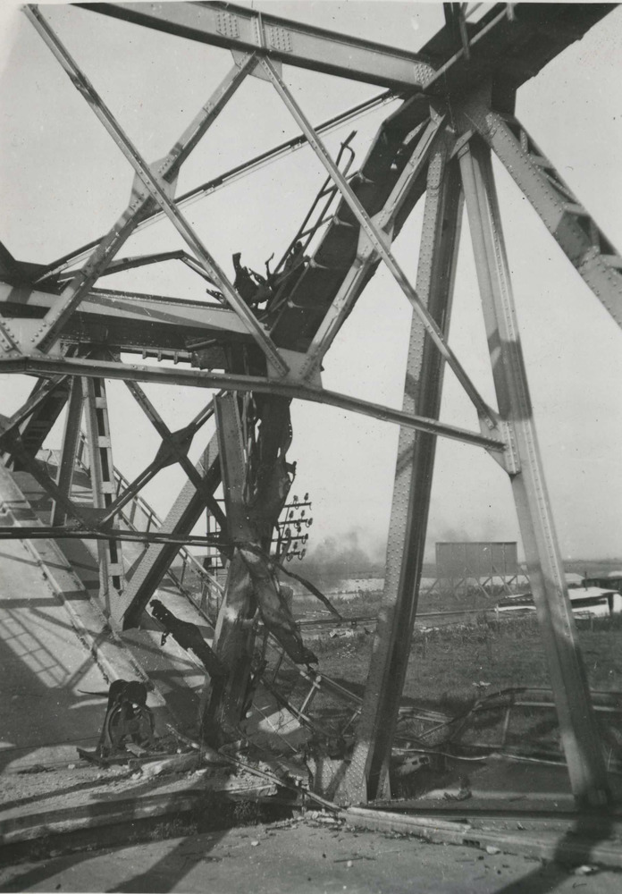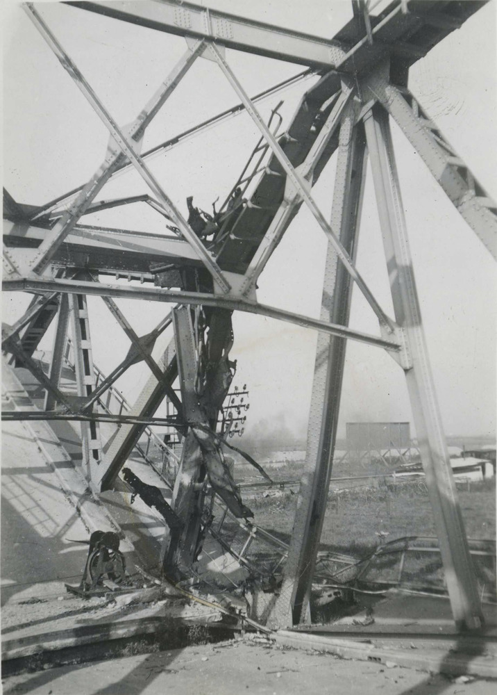 Opgevijzelde delen van de verkeersbrug over de Maas bij Grave Foto behoort tot een serie van 144 foto's betreffende oorl...
