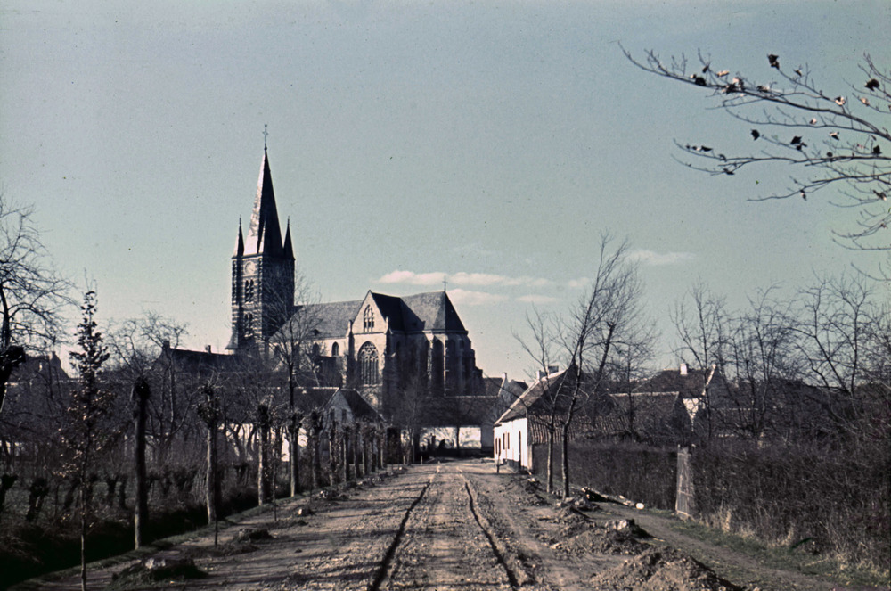 De kerk met toren met zware oorlogsschade, gezien vanuit het westen