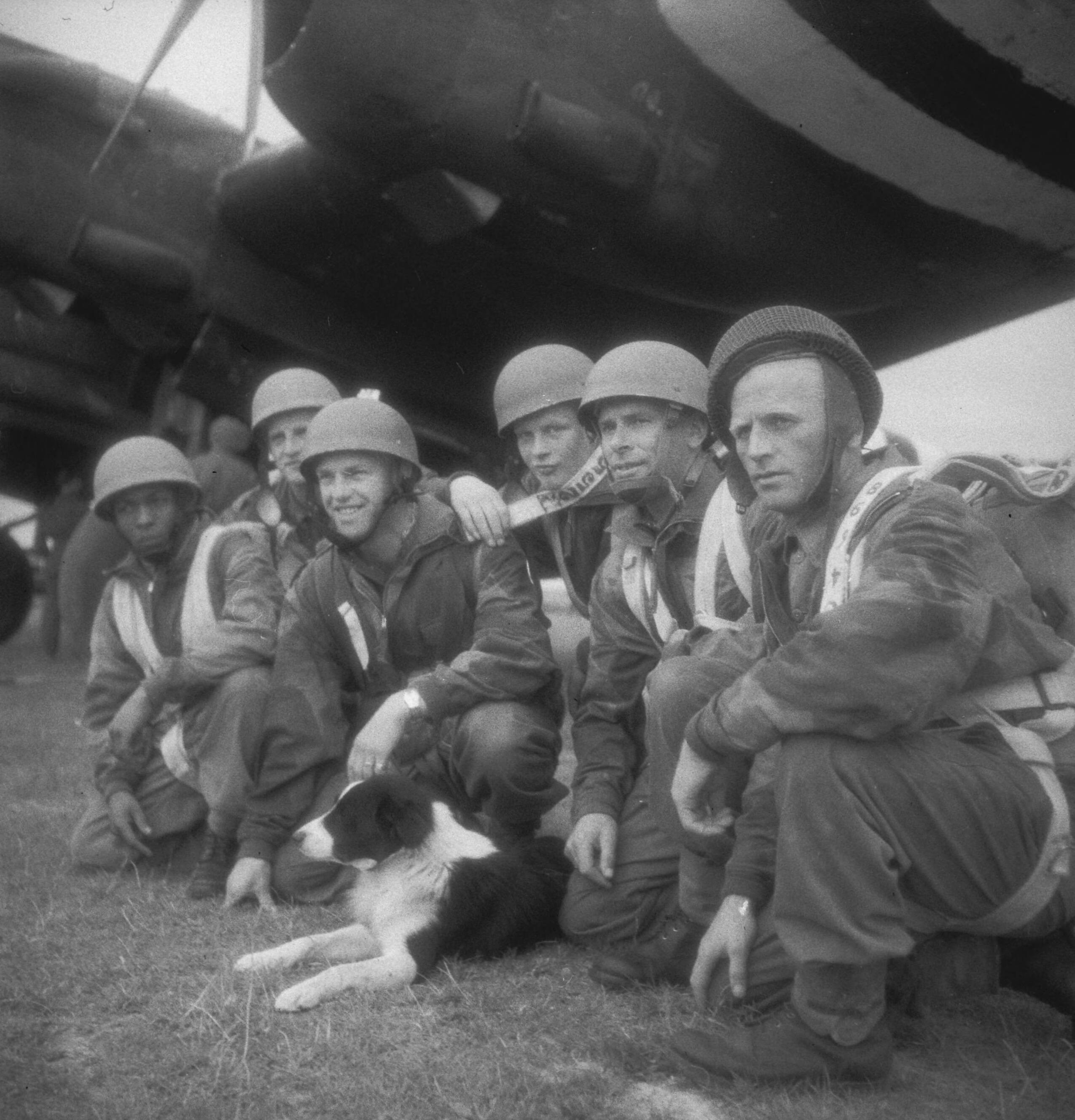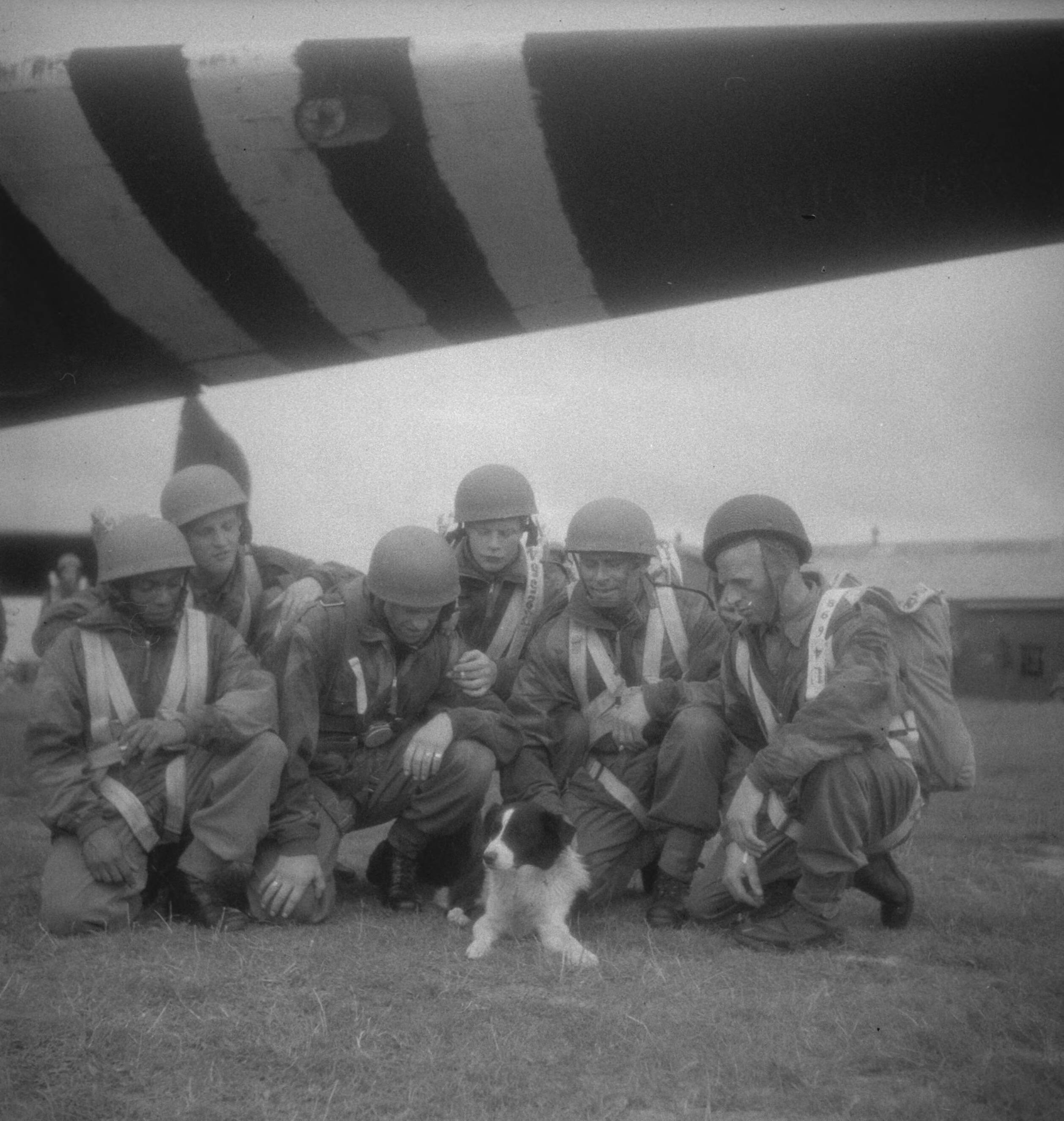 Nederlandse soldaten worden door de RAF getraind als parachutisten. Een groep parachutisten met hun mascotte, een hond