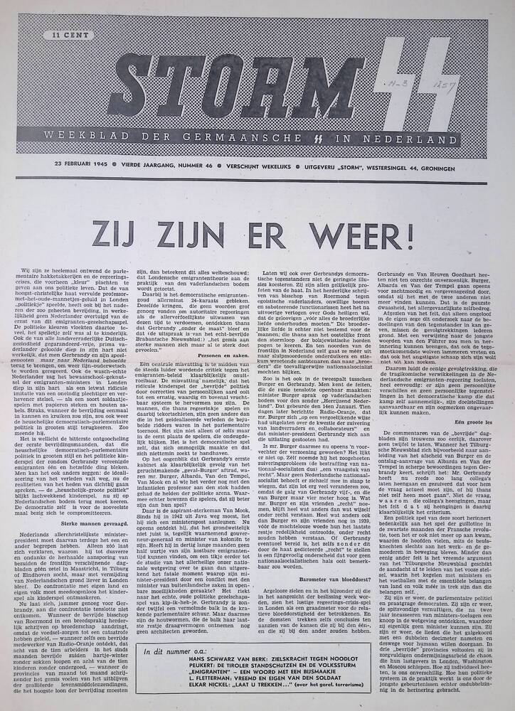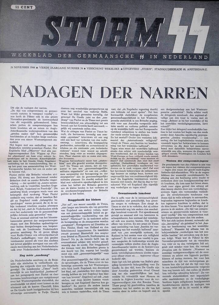 Storm SS, 5 maart 1943.Weekblad der Germaansche SS in Nederland.Tweede jaargang nr. 48.Uitgegeven door Uitgeverij Storm te Amsterdam. Het weekblad Storm verscheen voor het eerst op 11 april 1941 en het laatste nummer zag op 4 mei 1945 het licht. Het werd uitgegeven door de Nederlandsche SS.Waarom Indië capituleerde.scan van de voorpagina.