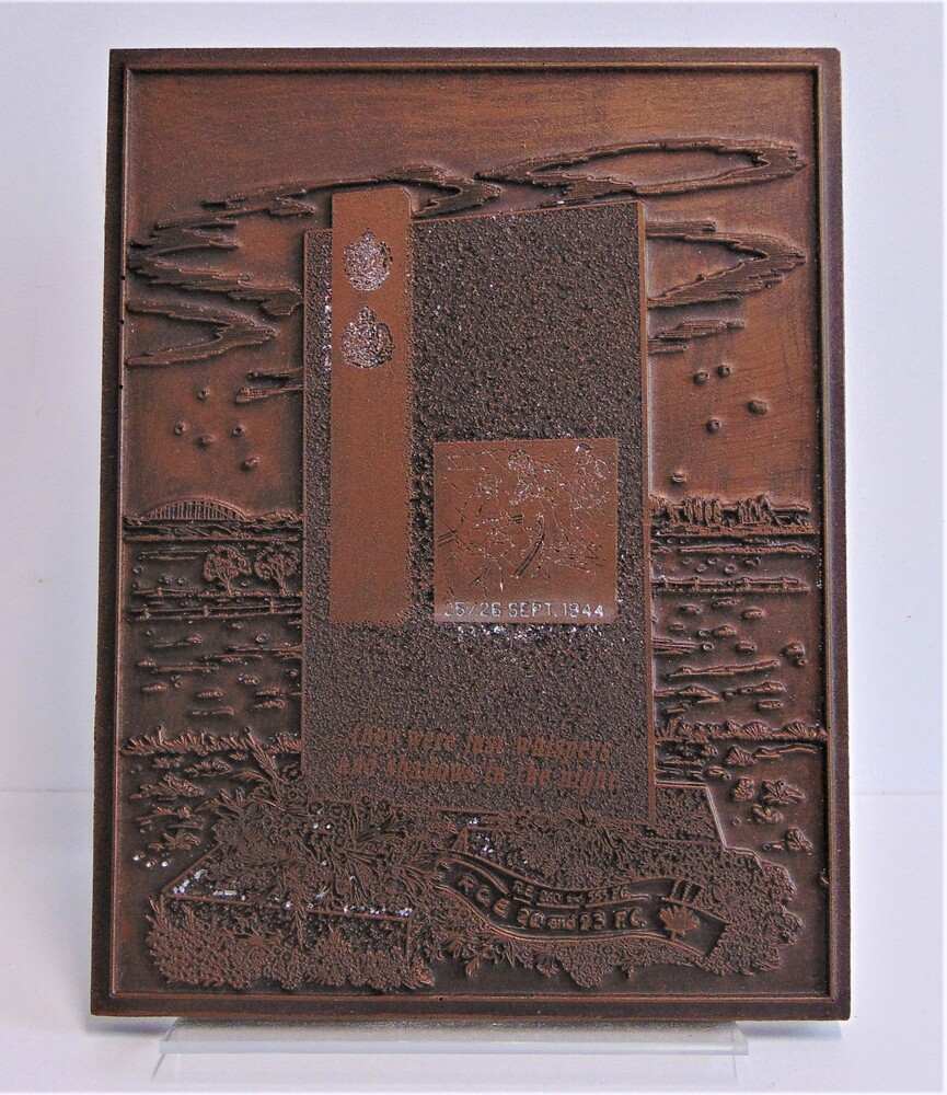 gedenkplaat, rivier en brug, 25/26 sept. 1944, brons, 1990, met tekst; "The were just whipers and shadows in the night, R.C.E 20 and 23 F.C., een maple leaf, op de achterzijde; 1944- Mimi/Ben/Corry/Leo- 1990