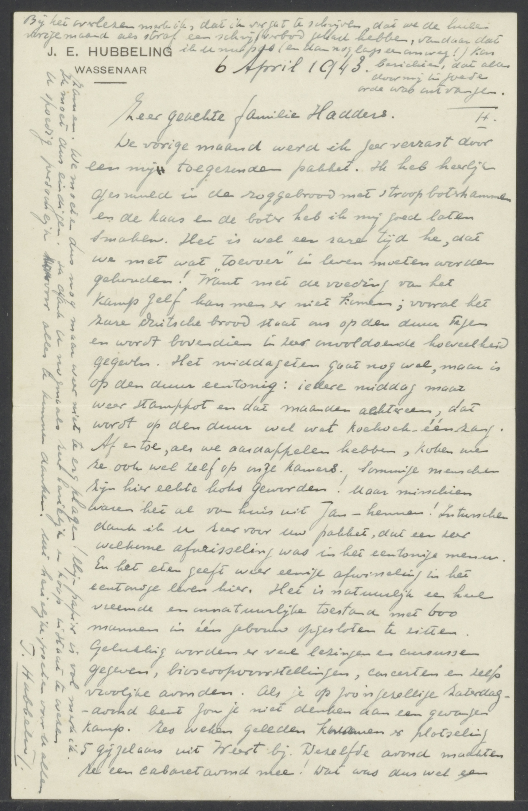 Van: Hubbeling, J.E. Aan: Hadders, familie Plaats: De Ruwenberg, kamp Datum: 1943-04-06 Onderwerp: de brief is op zijn eigen briefpapier vanuit het gijzelaarskamp De Ruwenberg in St Michelsgestel geschreven; beschrijving van het dagelijkse leven in het kamp; ‘Ik ontmoette hier de veehandelaar (Isedoor) Levie uit Assen. Zijn vrouw zit in Westerbork in een kamp en zijn beide kinderen zijn naar Polen ...