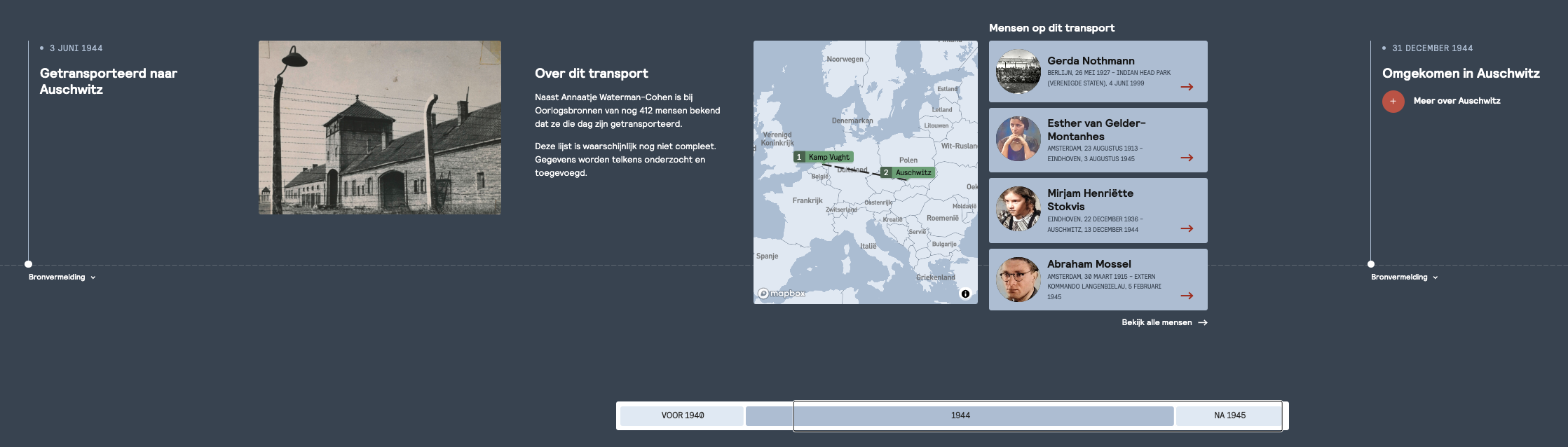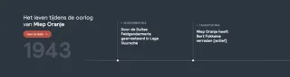 Daaronder vind je de bekende tijdlijn, maar deze kan nu full screen geopend wordenen scrollt horizontaal. De vernieuwde tijdlijn focust alleen op gebeurtenissen die direct betrekking hebben op de persoon zelf. Scans van bronnen die hieraan gelinkt zijn, worden direct bij de gebeurtenis getoond. Eventuele context en uitleg kunnen naar keuze geopend worden in een extra infoscherm. Dit maakt het beeld overzichtelijker en begrijpelijker.