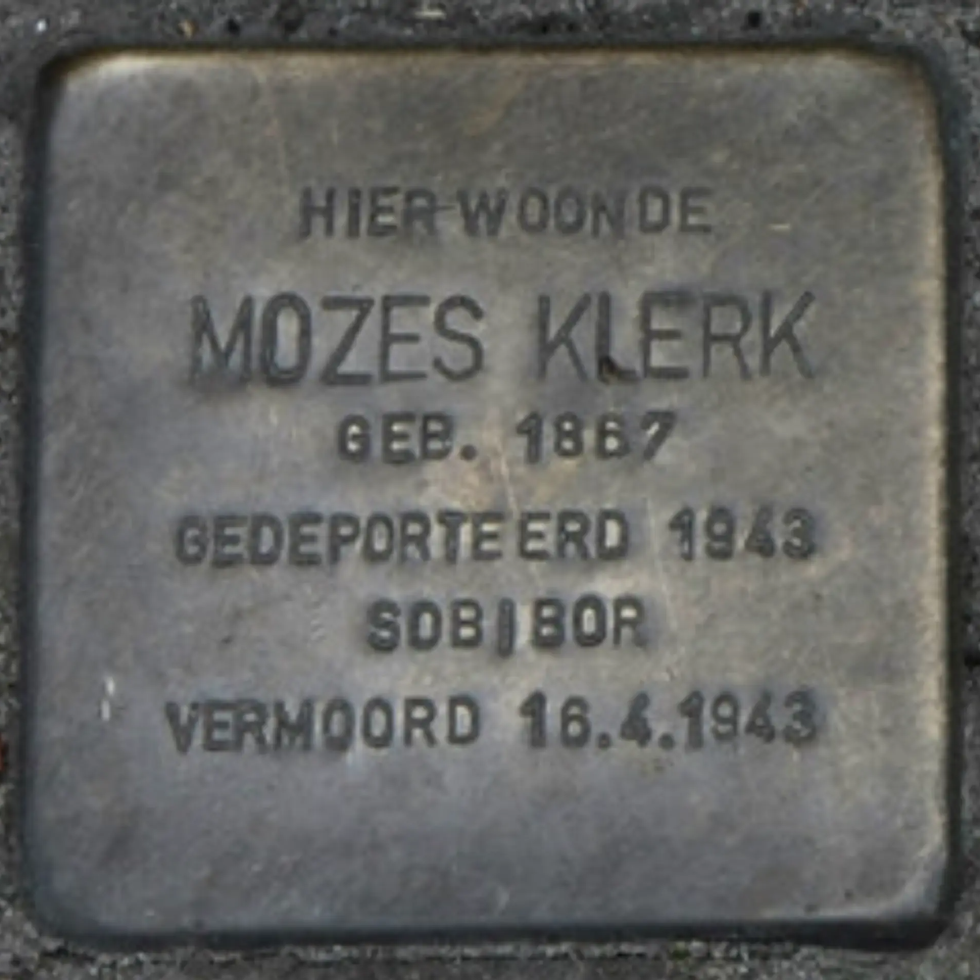 Eindhoven, 28 mei 1866 - Sobibor, 16 april 1943Mozes Klerk is op 22 november 1867 geboren in Amsterdam. Hij trouwt op 32 jarige leeftijd met de Eindhovense Julia Andriesse. Het echtpaar woont in Amsterdam en krijgen een zoon Levie. Levie is amper een half jaar oud als Julia sterft. Zeven maanden later wordt Mozes voor de tweede keer in korte lijd getroffen door een groot verlies: op 14 oktober 1902, een paar dagen voor zijn eerste verjaardag, sterft Levie.