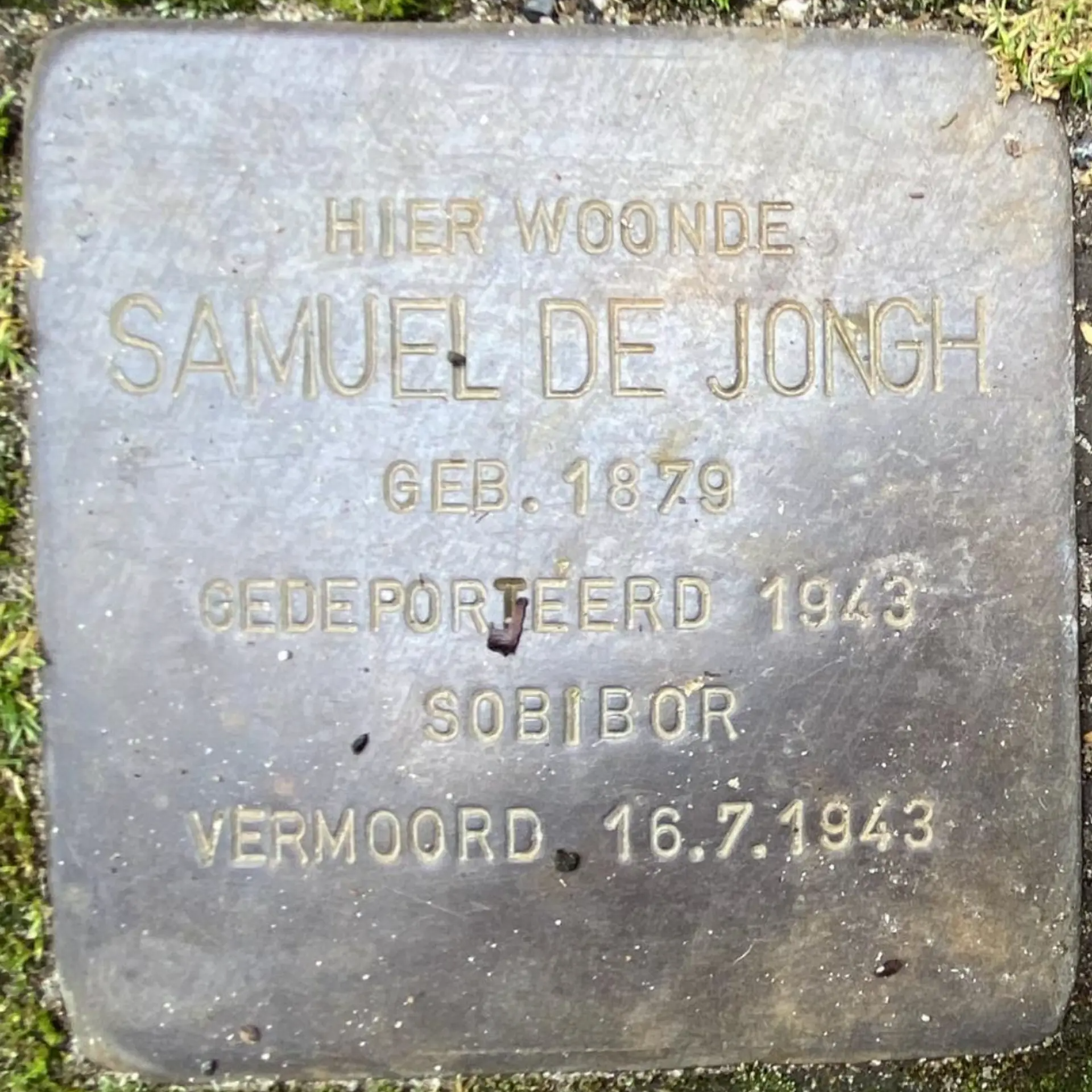 Amsterdam, 1 juli 1881 - Sobibor, 16 juli 1943Samuel de Jongh is op 2 februari 1879 in Eindhoven geboren. Zijn ouders zijn Benjam de Jongh en Eva Keijzer. De familie De Jongh woont al vóór 1800 in Eindhoven. Samuel de Jongh is koopman in lompen en oud ijzer.