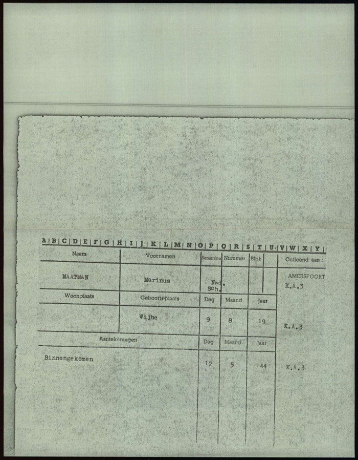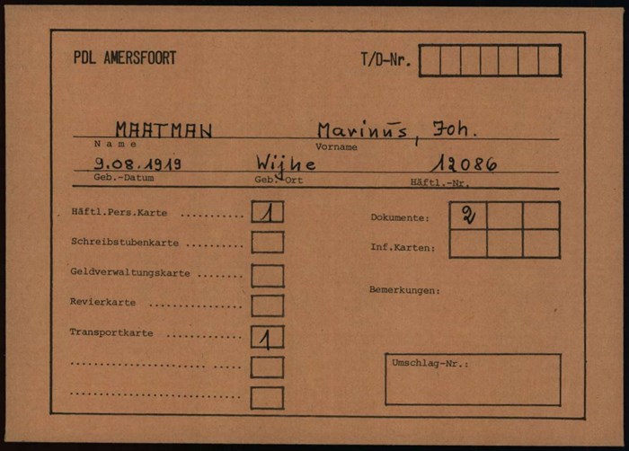Een namenlijst van 32.453 personen die gevangen zaten in Kamp Amersfoort. De lijst is samengesteld door Nationaal Monument Kamp Amersfoort en is niet online in te zien. Voor meer informatie over deze persoon kunt u contact opnemen via info@kampamersfoort.nl of een informatieaanvraag indienen via onderstaande link.