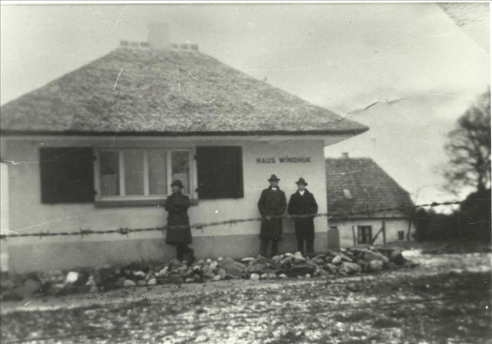 Kleef, drie mannen bij Haus Windhuk, een klein gebouw met rieten dak, prikkeldraad op voorgrond tekst achterop foto: Kleve: Bresserberg uit enveloppe: Fotos Vor- + Nachkriegszeit Kleve