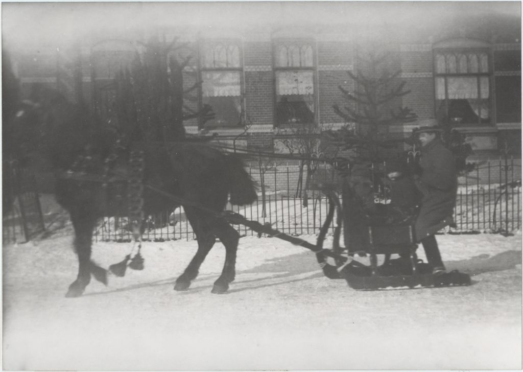 Het herenhuis aan de Oosteinderweg te Wognum rond 1920. Achter de arreslee de latere burgemeester van Nibbixwoud en Zwaag (van 1922-1956) Jan Wiering.
