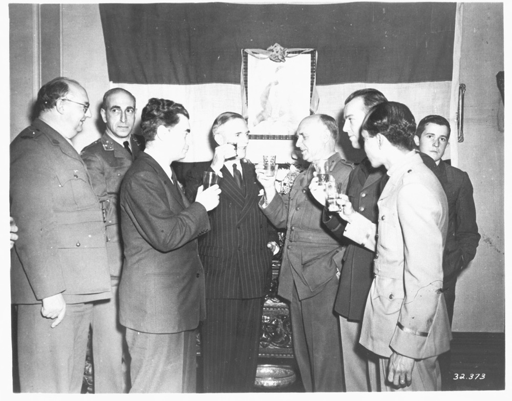 Celebration of liberation of Holland. On may 8, 1945, lieut.col. F.H. Wright, consul for the Netherlands, held a reception at his home at Toorak, Victoria, to celebrate the liberation of Holland after five years of occupation by the Nazis. Van links naar rechts: Frederic Daniell, N.W.L. van Straten, Joris Ivens, baron van Aerssen Beyeren van Voshol, P.H.Wright, luitenant Stevens, en de heer Almassawa. ...