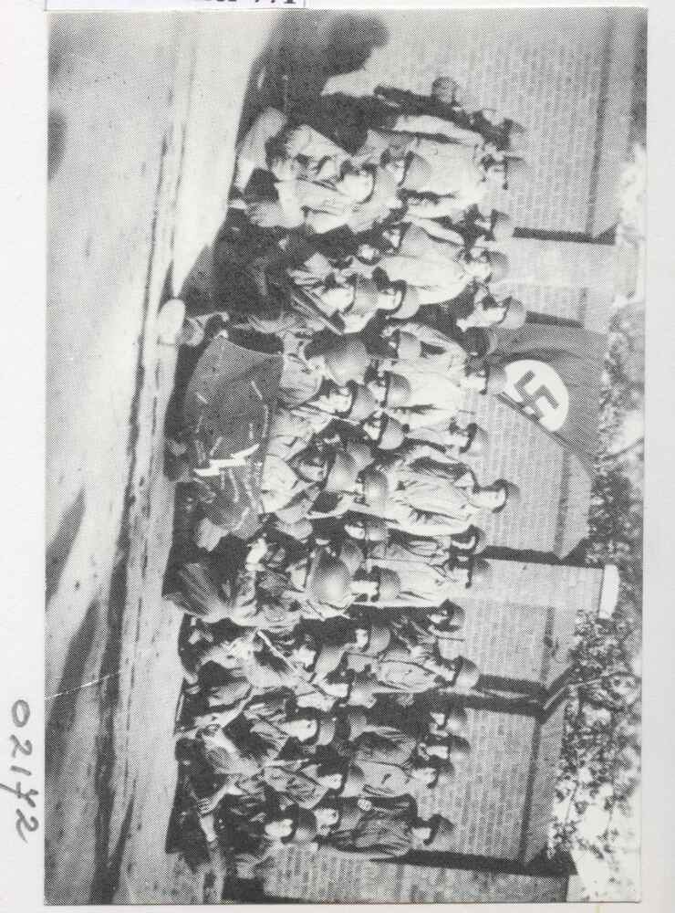 771 Voor de Kloostermuur poseren ongeveer 42 soldaten (Peloton?) met achter hun een duitse vlag met hakenkruis als troffee 1944 . Wie ...