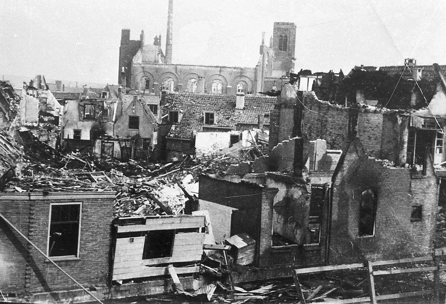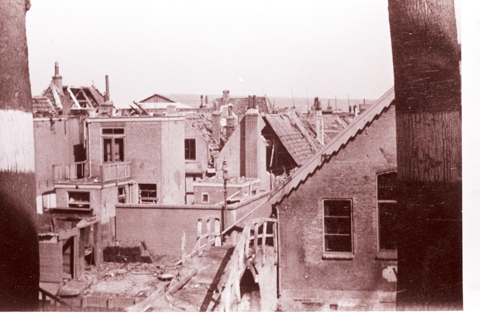 Verwoesting op de Geerkade als gevolg van het bombardement op 18 maart 1943 dat voor de oliefabriek Witol (achtergrond) was bedoeld.