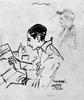 Jongeman, ter halver lijve zittend en profil naar links, schil- dert aan een tafel met verfpotten een bord ("unbefugten'). Rechtsboven een jongeman met pet, borststuk en profil naar links ("Smid/Francken").