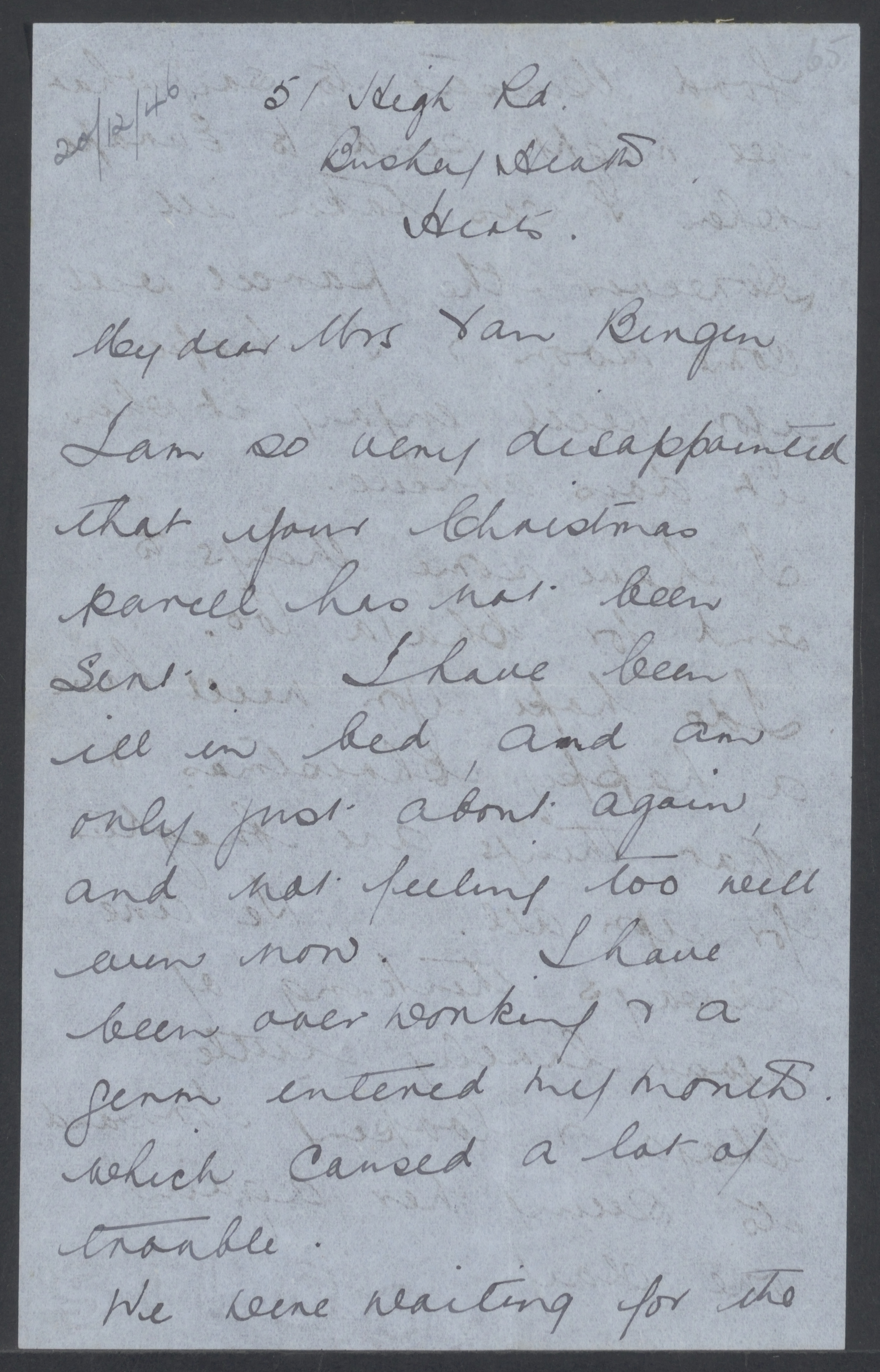 Aan Miss Jacobs - Berg en Dalscheweg 206 Nijmegen "dear Pop, Mum and Nelly" "S. Manackerman 1. Petworth Manchester" "28 mei 1945" "persoonlijke berichten van Engelse en Canadeese militairen aan de familie Jacobs te Nijmegen die hier gelegerd waren ter voorbereiding op de operatie Veritable"