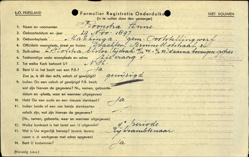 Duikadres: Elsloo - Oorspronkelijk adres: Bruins Slotstraat 36, Drachten - Reden onderduik: arbeidsinzet - Overige opmerkingen: Bijzondere opmerkingen: Ondergedoken van 14/10 '44 - 6/2 '45 in Elsloo, daarna huisadres