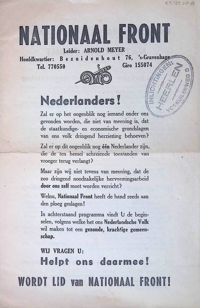 Zwart Front en Nationaal Front. In mei 1934 richtte de Brabantse katholieke journalist Arnold Meijer de fascistisch georiënteerde en duidelijk antisemitische beweging Zwart Front op. De nieuwe organisatie probeerde van meet af aan de NSB te overtroeven in radicalisme. Zwart Front wilde de macht veroveren langs de weg van revolutie. In april 1940 zette Arnold Meijer zijn beweging uit tactische overwegingen ...