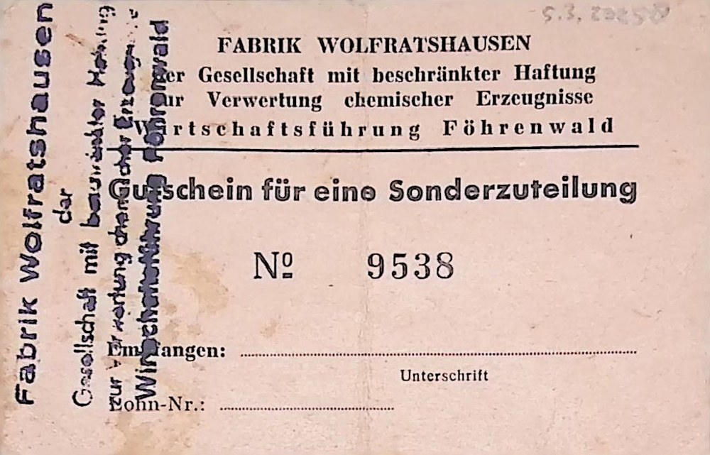 Kaart: Gutschein für eine Sonderzuteilung No. 9538 van Fabrik Wolfratshausen. Der Gesellschaft mit beschränkter Haftung zur Verwertung chemischer Erzugnisse, Wirschaftsführung Föhrenwald.met op de achterkant de naam Truus Gelsing
